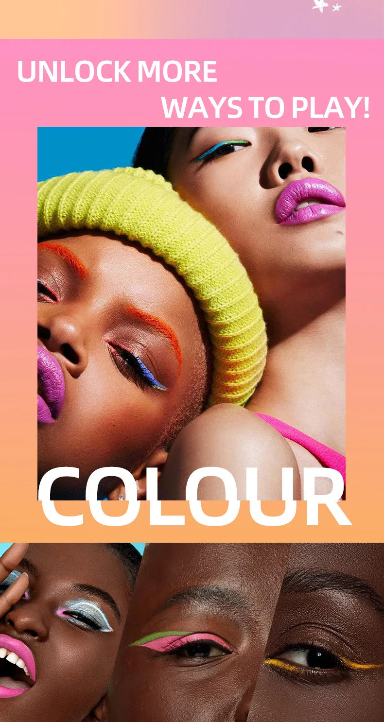 12 different colorful bright pigment liquid eyeliners, perfect for parties, makeup shows, live performances, prom nights, dance parties and wedding makeup. With unique packaging, it is a perfect gift for friends, besties, family.